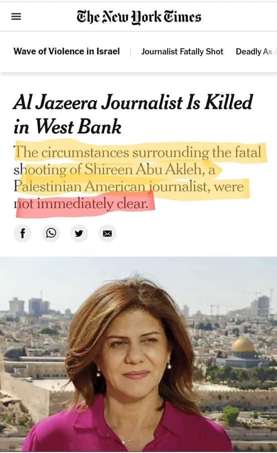 وعلى سبيل المثال لا الحصر، فقد افتتحت صحيفة “نيويورك تايمز” الأمريكية تغطيتها، لجريمة اغتيال “أبو عاقلة” بتقرير بدأ بأن “ملابسات الحادث غير واضحة.”