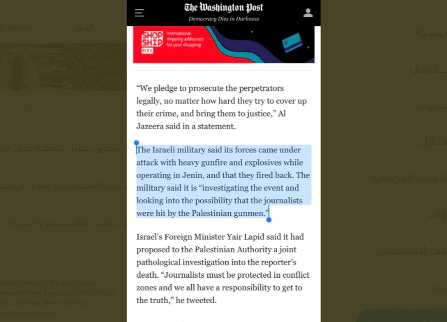 هذا واستندت تلك الصحف في تغطيتها لجريمة اغتيال شيرين أبو عاقلة، لراوية الاحتلال، وتجاهلت متعمدة شهادات العيان الكثيرة من صحفيين عرب وأجانب كانوا متواجدين في موقع الجريمة لتغطية اقتحام الاحتلال لمخيم جنين.