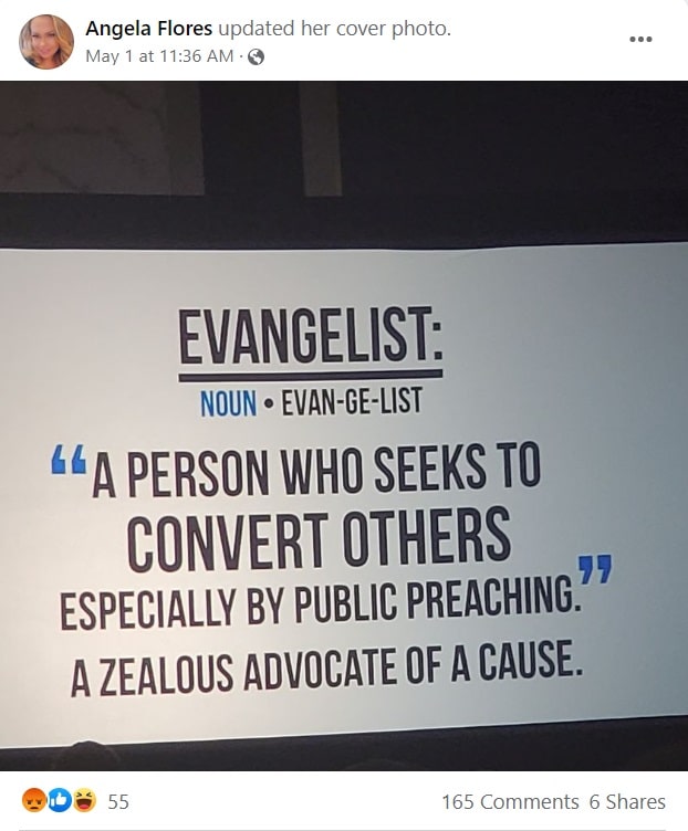 وكان أحدث منشور مرئي على الملف الشخصي لفلوريس بفيسبوك، هو صورة لافتة كتب عليها: “المبشر: شخص يسعى إلى تحويل الآخرين خاصة عن طريق الوعظ العام. مدافع متحمس عن قضية”.