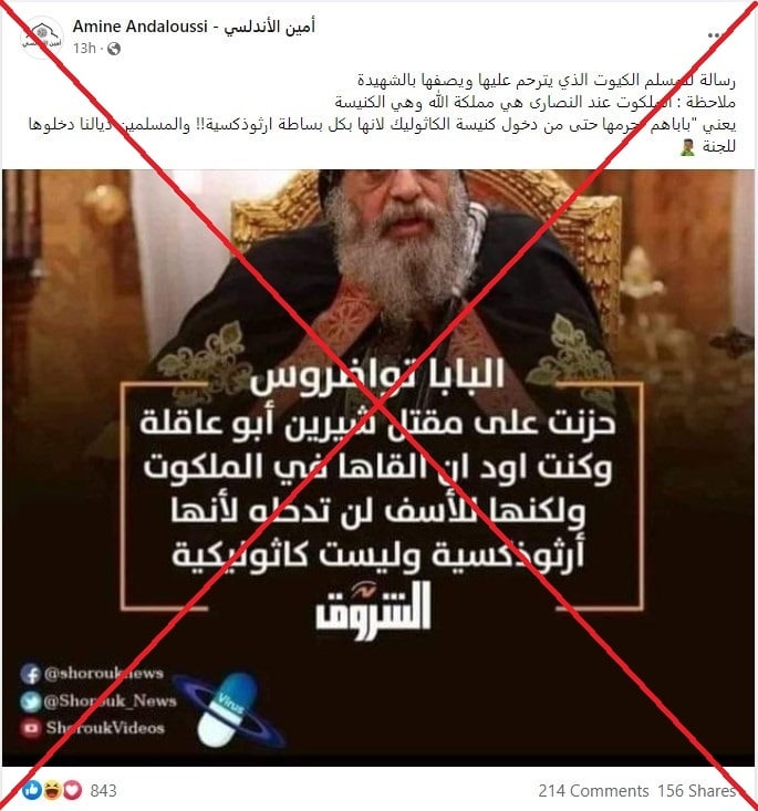 ووفقا للمنشور الذي تم تداوله ورصدته “وطن”، فقد روج لتصريح لـ”البابا” منسوب لصحيفة “الشروق” المصرية، قال فيه تعليقا على وفاة “شيرين أبو عاقلة: “حزنت على مقتل شيرين أبو عاقلة. وكنت أودّ أن ألقاها في الملكوت. ولكنّها للأسف لن تدخله لأنها أرثوذكسيّة وليست كاثوليكية”.
