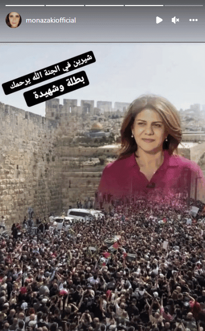 من جانبها أيضا، كتبت منى زكي عبر ستوري حسابها على انستجرام: “شيرين في الجنة الله يرحمك.. بطلة وشهيدة”.