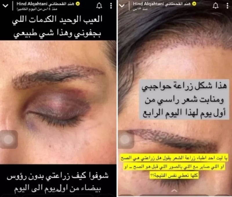 وعبر حسابها على “سناب شات”، نشرت هند القحطاني صورة رأسها مكان إجراء العملية. وعقبت: “الصورة من الكاميرا العادية عشان يتضح لكم مكان زراعة الشعر في مقدمة الرأس والحواجب”.