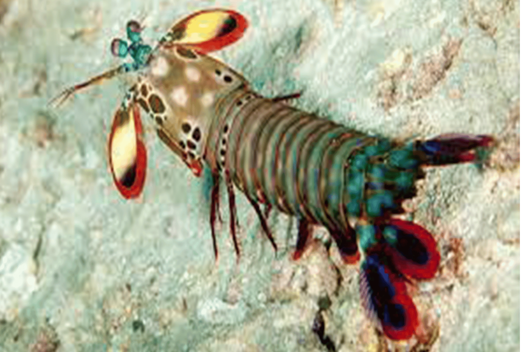 لحيوان السرعوف الروبيان، نظام بصري أكثر تعقيدًا. يحتوي على ما لا يقل عن 16 نوعًا مختلفًا من خلايا المستقبلات الضوئية – أربع مرات أكثر من البشر – نصفها مرتبط بإدراك الألوان. في أعيننا، كل مخروط: أي أحمر وأخضر وأزرق، له صبغة بصرية واحدة فقط ، تسمى opsin، والتي تثيرها موجة معينة من الطول. ومع ذلك، في 8 مستقبلات ضوئية مخصصة لإدراك اللون في سرعوف الروبيان؛ يوجد ما مجموعه 33 opsins/أوبسينس.