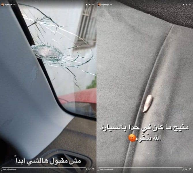 وأوضحت بريجيت التي تتواجد في كندا حالياً، أن والدها الفنان عبدو ياغي أرسل صور سيارتها في لبنان لها، ويظهر الزجاج مكسوراً والرصاصة مستقرة داخل السيارة.