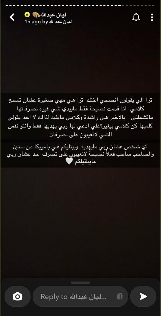 وقالت ليان في حسابها على “سناب شات” عبر خاصية “الاستوري”، إنها تتعجب من الذين يخاطبونها بأن تنصح أختها، مشددة على أن شقيقتها ليست صغيرة لتنصحها.