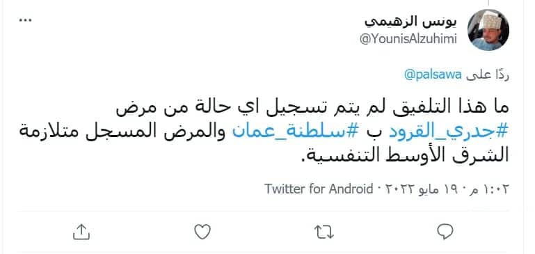 مؤكدا أنه “لم يتم تسجيل أي حالة من مرض جدري القرود بسلطنة عمان، وأن المرض المسجل هو متلازمة الشرق الأوسط التنفسية.”