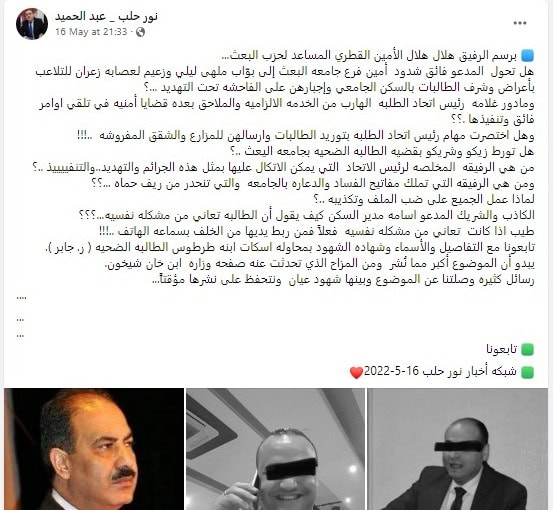 وتساءل أدمن الصفحة في منشور على “فيسبوك” هل تحول أمين فرع جامعه البعث المدعو فائق شدود إلى بوّاب ملهى ليلي وزعيم لعصابه زعران. للتلاعب بأعراض وشرف الطالبات بالسكن الجامعي وإجبارهن على الفاحشة تحت التهديد؟”