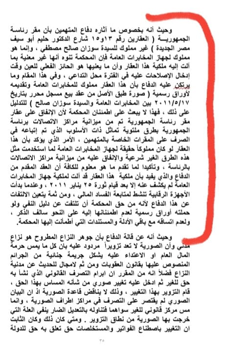 ووفقا لحيثيات المحاكمة التي حصل عليها موقع “عربي 21“، فإن محل العقارين الذين حملا الرقم 13 والرقم 15 في شارع “الدكتور حليم أبو سيف” في منطقة مصر الجديدة، تم تحرير عقد بيعهما في مسجل رسمي في الشهر العقاري بمكتب توثيق “مصر الجديدة” بين “سوزان مبارك” كطرف أول بائع وبين “جهاز المخابرات العامة” المصرية كطرف ثان مشتري وحرر العقد بتاريخ 17 أيار/ مايو 2011.