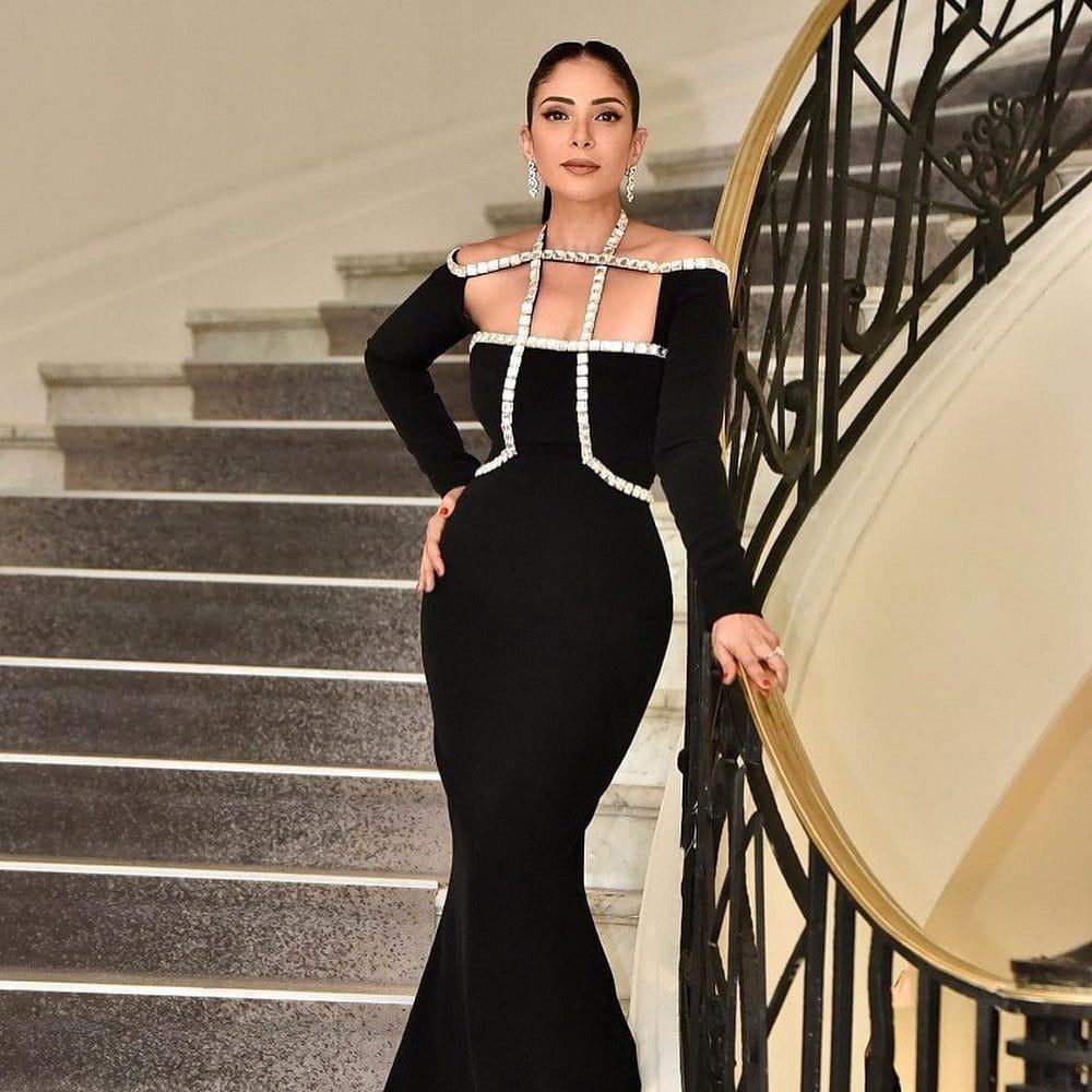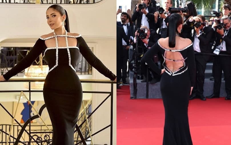 وظهرت منى زكي في إحدى فعاليات مهرجان كان بفستان أسود طويل، يتميز بوجود عدة فتحات في منطقة الصدر والظهر.