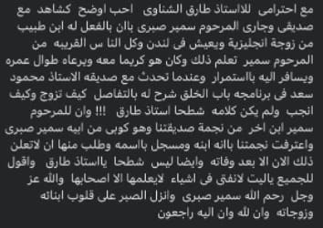 وقال بحسب ما رصدت (وطن) ما نصه:”للمرحوم ابنا آخرا من نجمة صديقتنا وهو نسخة طبق الأصل من أبيه، سمير صبري.”