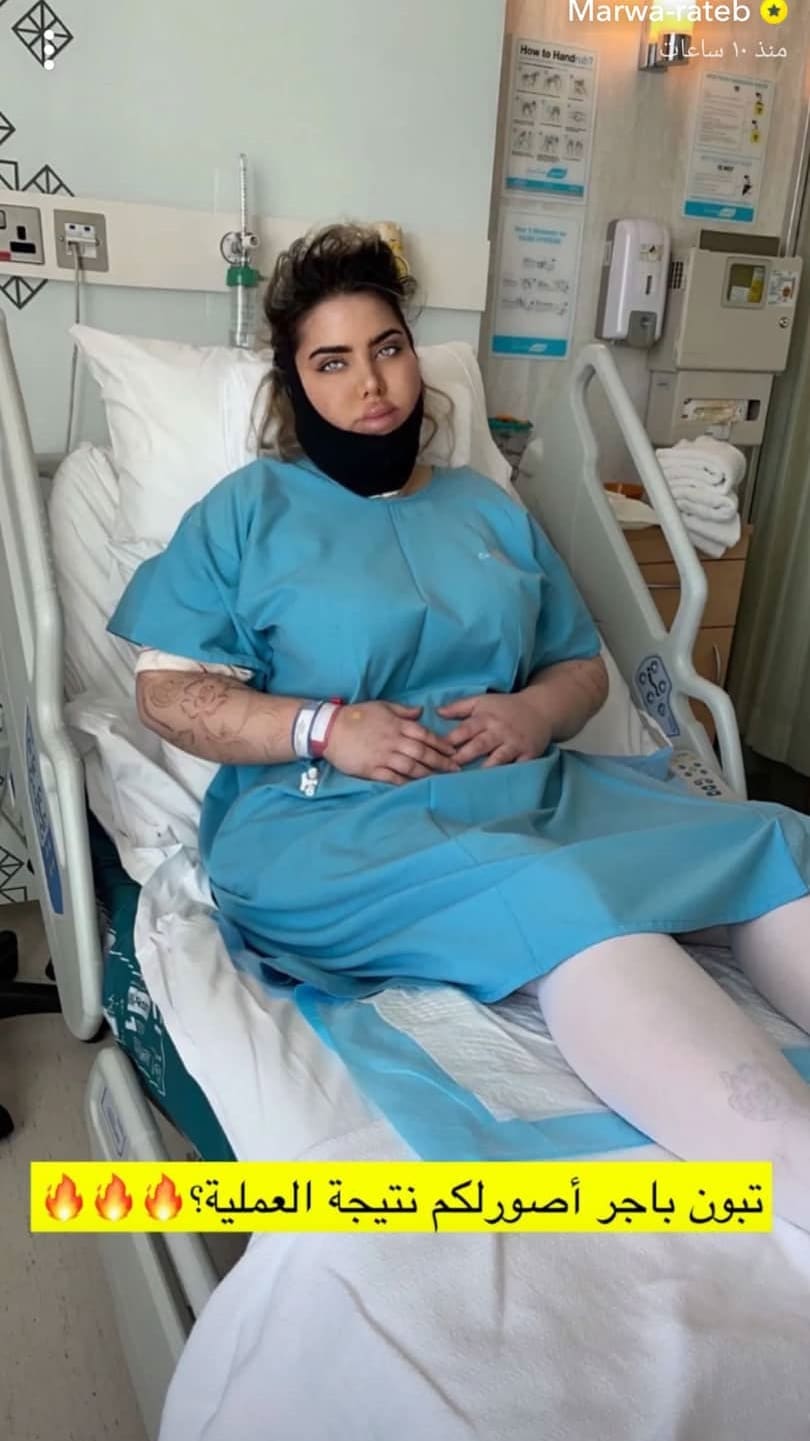 وظهرت مروة منهكة على سرير المستشفى، وترتدي الزي الخاص بالعمليات. وكتبت: “تريدون غداً أن أصور لكم نتيجة العملية؟”.