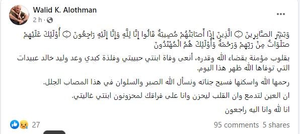 ونعى والدها وليد عبيدات ابنته، وكتب عبر حسابه على “فيسبوك”: “بقلوب مؤمنة بقضاء الله وقدره، أنعى وفاة ابنتي حبيبتي وفلذة كبدي وعد وليد خالد عبيدات التي توفاها الله ظهر هذا اليوم”.
