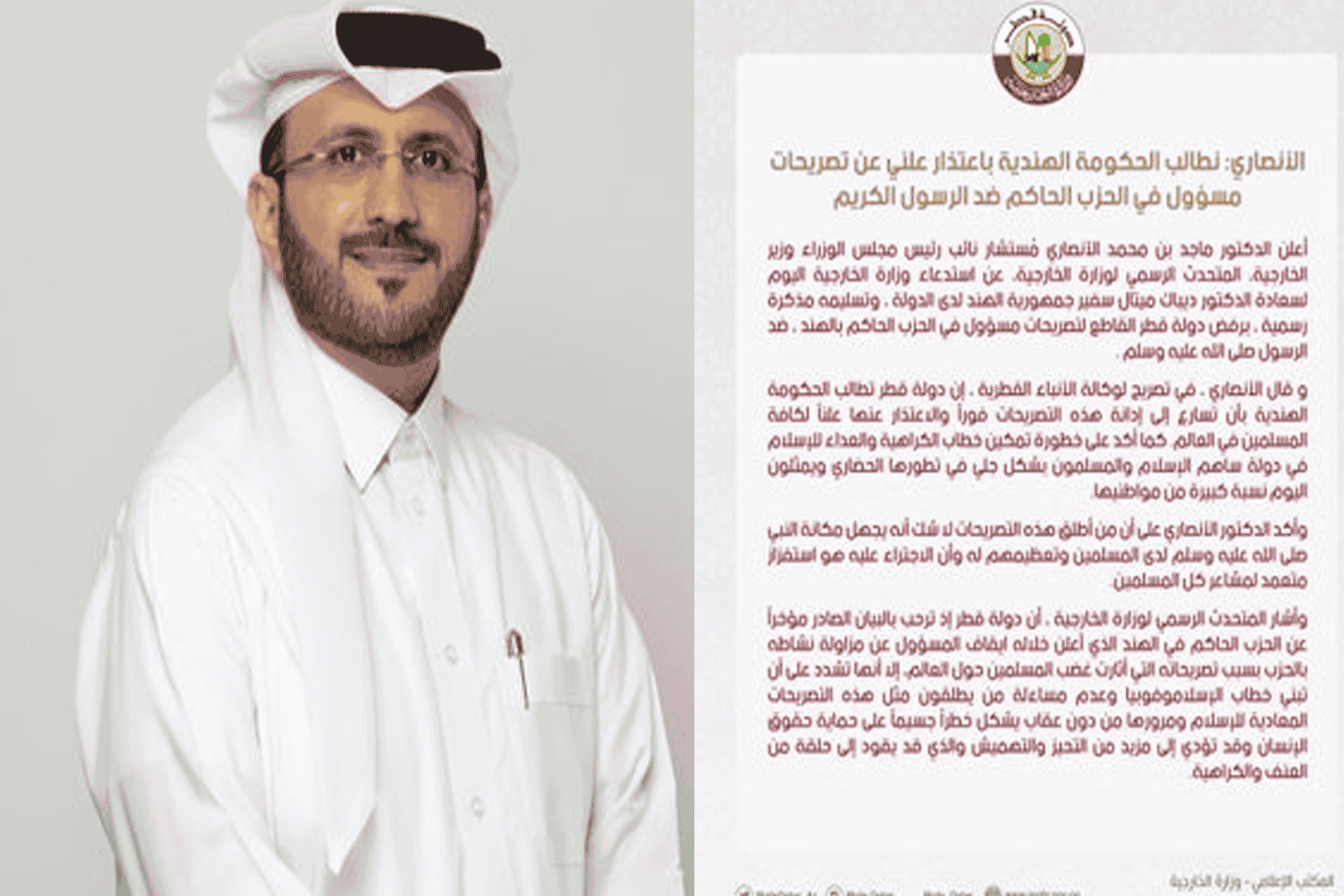 في الإطار نفسه، قال المتحدث الرسمي لوزارة الخارجية القطرية ماجد بن محمد الأنصاري، إن من أطلق هذه التصريحات – في إشارة إلى المسؤول الهندي – يجهل مكانة النبي صلى الله عليه وسلم لدى المسلمين وتعظيمهم له، لافتا إلى أنّ الجرأة عليه هو استفزاز متعمد لمشاعر كل المسلمين.