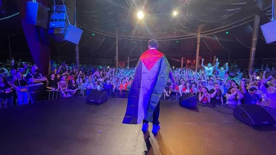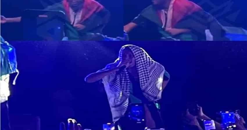 كما تداول ناشطون مقطع له وهو يرتدي الكوفية الفلسطينية على رأسه خلال الحفل، وسط تفاعل كبير جدا من الحضور.