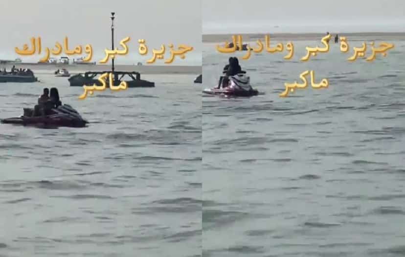 ويظهر بالفيديو الذي تم تداوله عبر مواقع التواصل الاجتماعي، على نطاق واسع، شاب وفتاة بوضعية مخلة على دراجة مائية (جيت سكاي)، في وسط الماء.