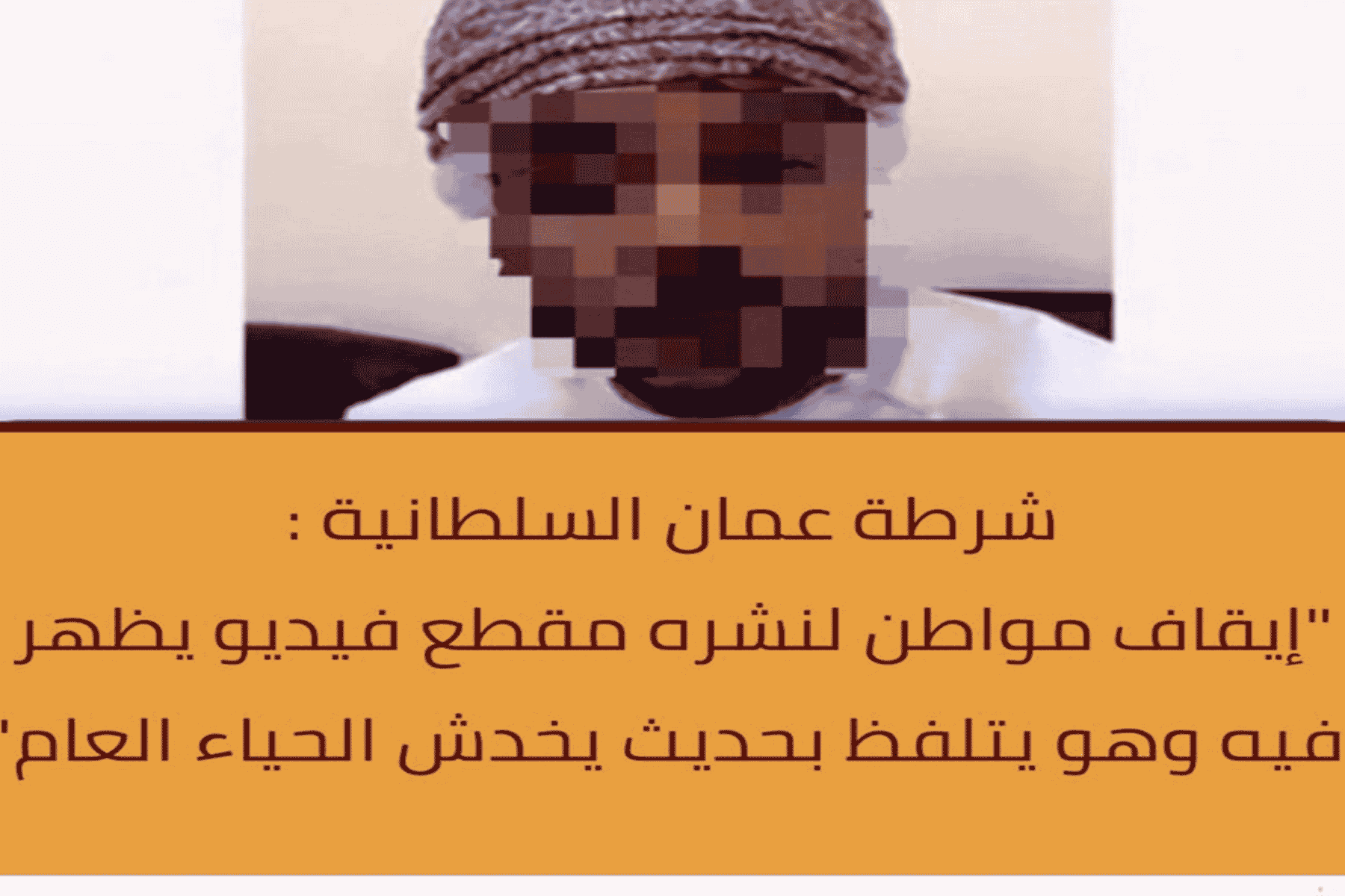 وطن- تسبب مقطع فيديو لمواطن عماني وصف بأنه “خادش للحياء العام ويقلل من هيبة المجتمع”، في موجة غضب واسعة على مواقع التواصل ما استدعى تدخل السلطات، التي أفادت بأنه تم إلقاء القبض على المواطن الذي ظهر بالمقطع.