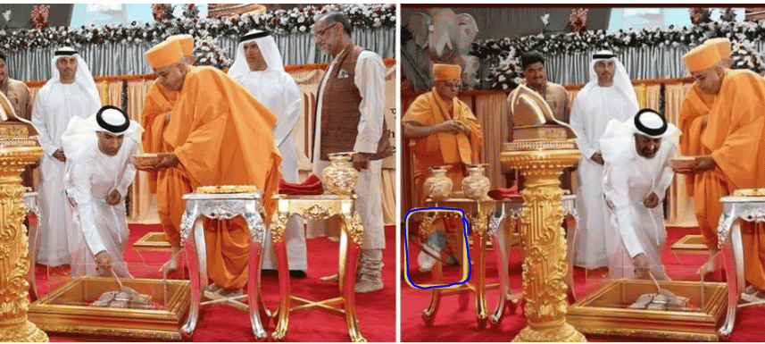 الحقيقة الوحيدة بهذه الصورة هي أن الإمارات بالفعل سمحت في هذا التاريخ ببناء أول معبد هندوسي على أرضها، وتم وضع حجر الأساس من قبل الوزير “الزيودي” كما يظهر بالصورة.