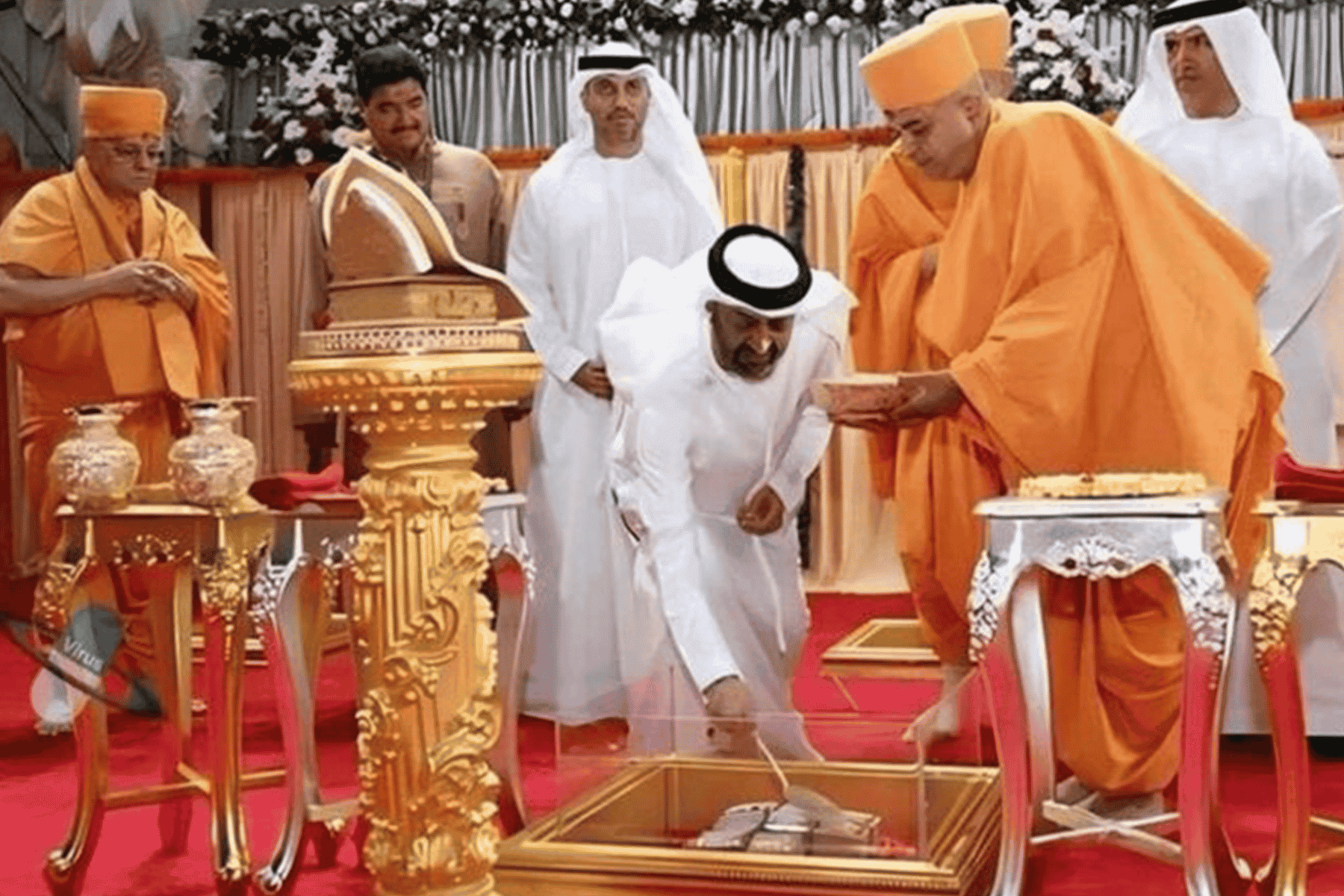 الصورة التي انتشرت على نطاق واسع وتسببت في هجوم عنيف على الرئيس الإماراتي، بالتزامن مع إساءات الهندوس للإسلام والرسول، تظهره وسط عدد من الرهبان الهندوس والمسؤولين الإماراتيين وهو يضع حجر الأساس لأول معبد هندوسي بالبلاد.