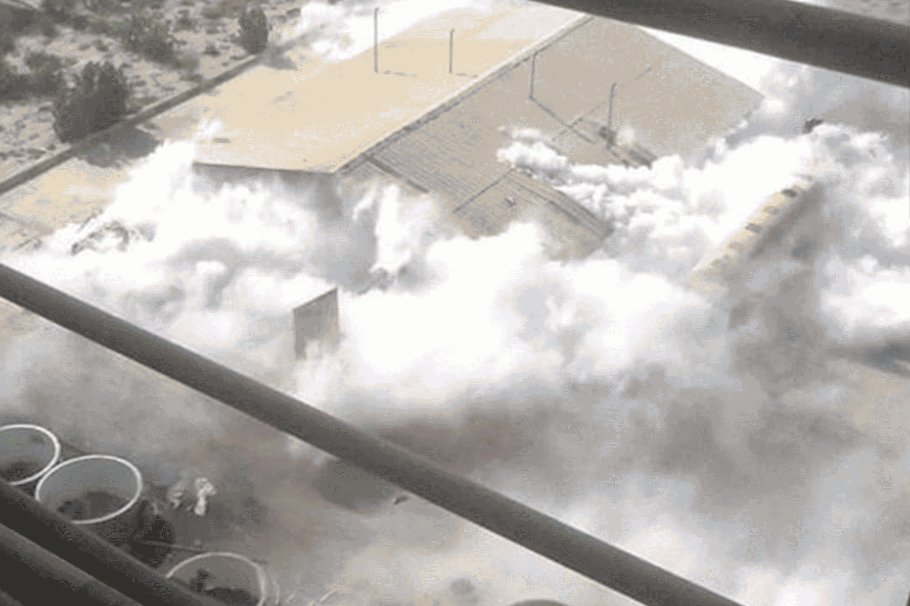 كما أظهرت مقاطع مصورة التقطت من الأعلى أدخنة بيضاء اللون تنبعث بالقرب من خزانات فوق أسطح أحد الأبنية.