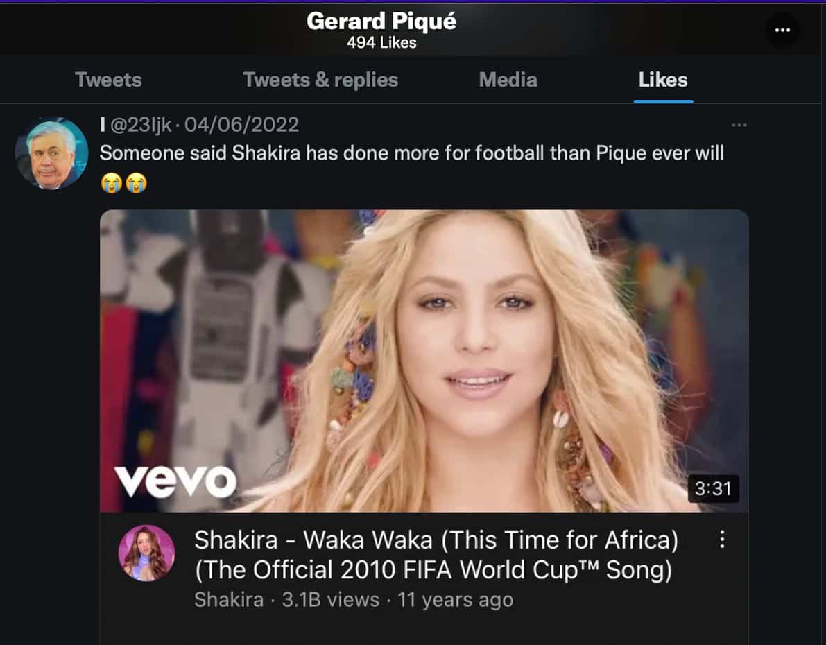 وطن– وضع جيرارد بيكيه مدافع برشلونة الإسباني، علامة إعجاب على تغريدة مثيرة للجدل ومهينة له، تقلل من قدراته كلاعب كرة القدم، بالمقارنة مع حبيبته السابقة المطربة الكولومبية شاكيرا.