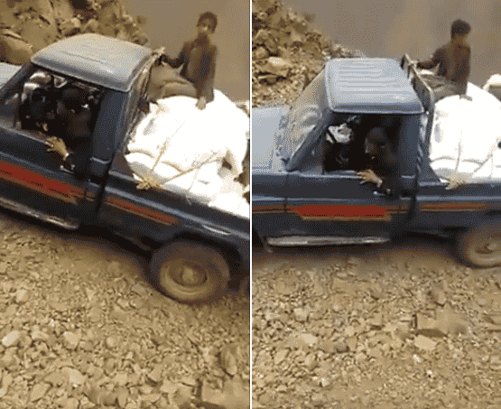ووفقا للفيديو، فبينما كان السائق يحاول الصعود بالسيارة المحملة بأكياس دقيق على ما يبدو ، انزلقت السيارة للخلف وسقطت في الوادي، حيث كان يجلس في كابينتها الخلفية عدد من الأشخاص.