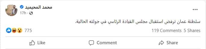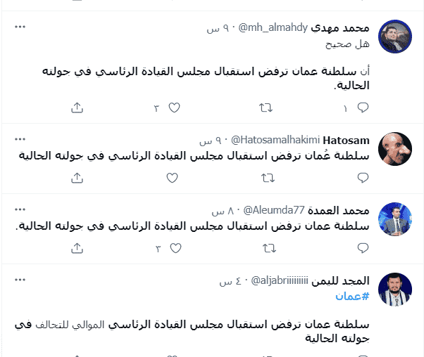 وطن – ضجّ موقع التدوين المصغر “تويتر” بانتشار شائعة حول رفض سلطنة عمان استقبال مجلس القيادة الرئاسي اليمني الذي يقوم في جولة حاليا لعدد من الدول العربية.