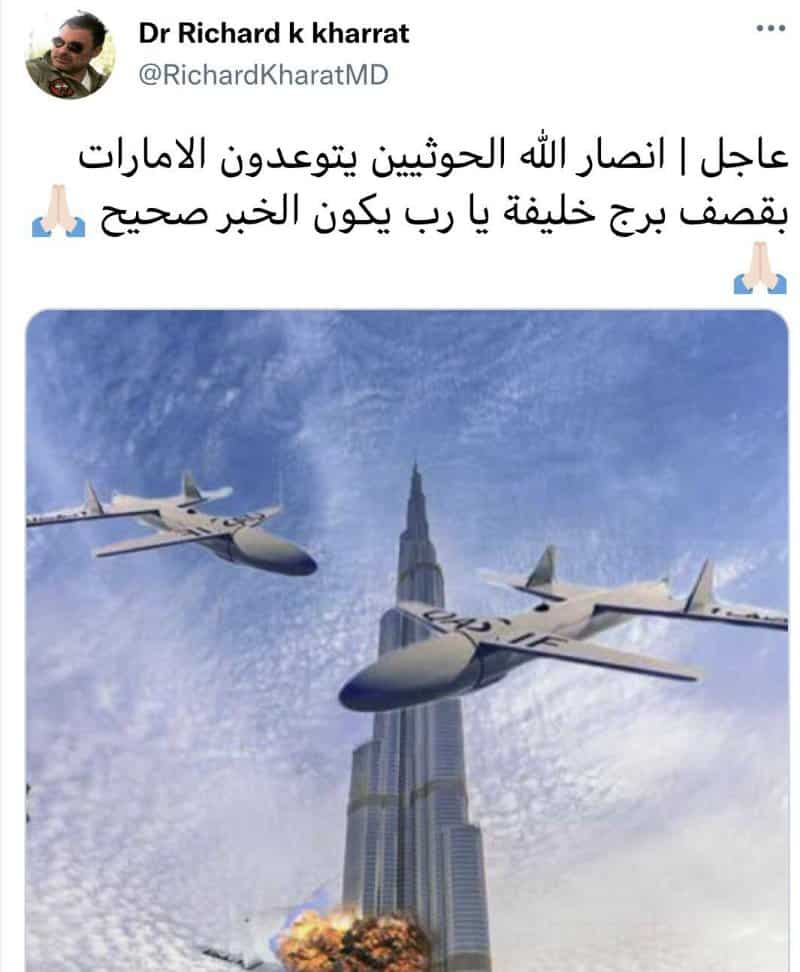 ويشار إلى أن التغريدة التي يقصدها “خراط” وتسببت باعتقاله في الإمارات، نشرها قبل عامين على حسابه بتويتر، تحت عنوان “عاجل أنصار الله الحوثيين يتوعدون الإمارات بقصف برج خليفة.. يارب يكون الخبر صحيح”.