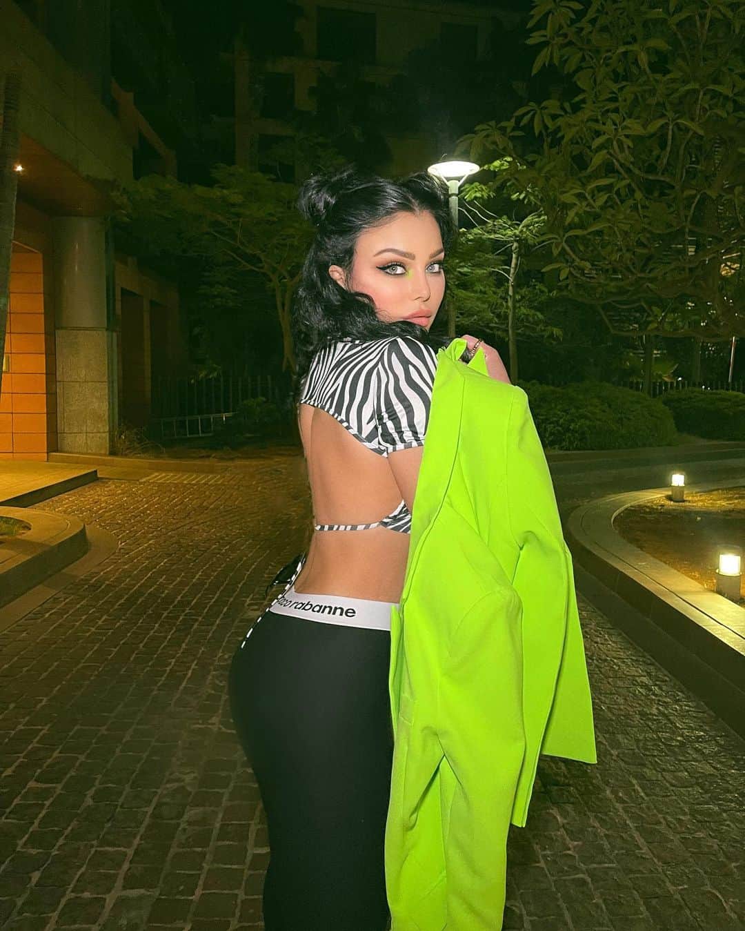 ونسقت النجمة اللبنانية معه كروب توب مكشوفة الظهر باللونين الأبيض والأسود. واعتمدت بلايزر باللون الأخضر الفاتح، مع حذاء من الكعب العالي باللون نفسه.
