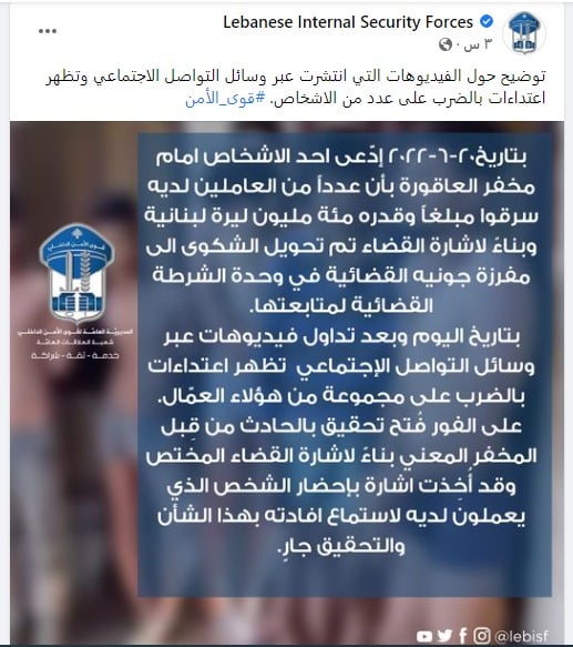 وأصدرت المديرية العامة لقوى الأمن الداخلي اللبنانية توضحاً بخصوص الحادثة أشارت فيه إلى أنه بتاريخ 20/6/2022 ادعى أحد الأشخاص أمام مخفر العقاورة بأن عدداً من العاملين لديه سرقوا مبلغاً وقدره مئة مليون ليرة لبنانية وأضافت المديرية أنه بناء لإشارة القضاء تم تحويل الشكوى إلى مفرزة جونية القضائية في وحدة الشرطة القضائية لمتابعتها بتاريخ اليوم وبعد تداول فديوهات عبر وسائل التواصل الاجتماعي تظهر اعتداءات بالضرب على مجموعة من هؤلاء العمال على الفور فتح تحقيق بالحادث من قبل المخفر المعني بناء لاشارة القضاء المختص وأخذا إشارة بإحضار الشخص الذي يعملون لديه لاستماع إفادته بهذا الشأن.