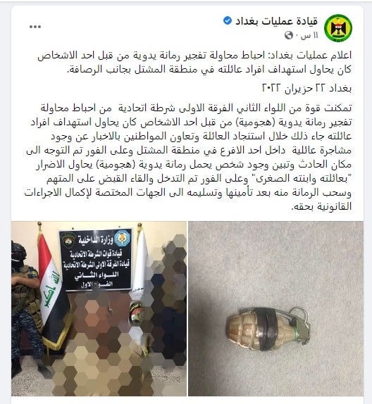 وقالت غرفة عمليات بغداد عبر حسابها الرسمي على “فيسبوك” إن “قوة من اللواء الثاني الفرقة الاولى شرطة اتحادية، تمكنت من احباط محاولة تفجير رمانة يدوية (هجومية) من قبل احد الاشخاص كان يحاول استهداف افراد عائلته”.
