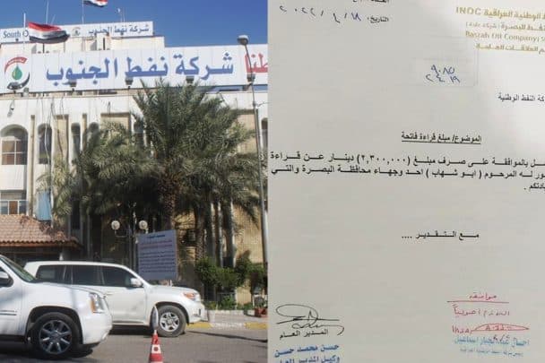 وطن- تداول نشطاء عراقيون وثيقة صادرة عن شركة النفط الوطنية، تتضمن طلباً بصرف 1.3 مليون دينار مقابل “قراءة الفاتحة” على روح أحد وجهاء محافظة البصرة، وحصلت الموافقة رسمياً على صرف المبلغ.
