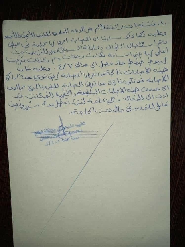 وتم نقل تهاني، وهي أم لطفلين سريعاً إلى مستشفى سحمر لإسعافها بعد إصابتها بنزيف حاد.