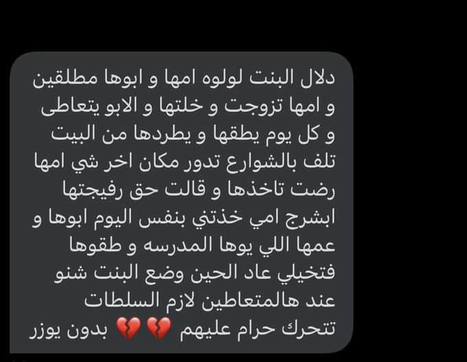 وكتبت أخرى أن والدي لولوة منفصلين، وأنها تقيم مع والدها المتعاطي والذي يضربها كل يوم، بينما تزوجت والدتها وتركتها لمصيرها.