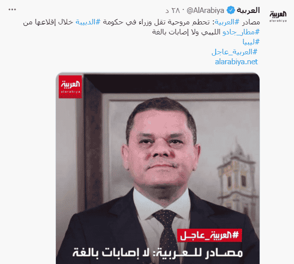 وقالت في تغريدة أخرى:” الدبيبة ينفي للعربية خبر تحطم مروحية تقل وزراء بحكومته”.