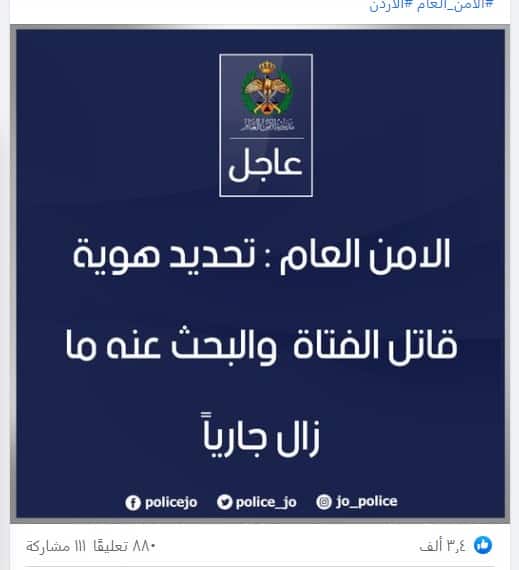 وطن – أكد الناطق الإعلامي باسم مديرية الأمن العام أن فريق التحقيق الخاص المشكل لمتابعة التحقيقات في حادثة مقتل الطالبة إيمان ارشيد داخل جامعة العلوم التطبيقية، الخميس، عمل منذ اللحظة الأولى وبجهود متواصلة تمكن من خلالها من تحديد هوية الجاني والذي خطط لجريمته وحاول قدر الإمكان اخفاء هويته وأثره عبر أساليب مضللة.