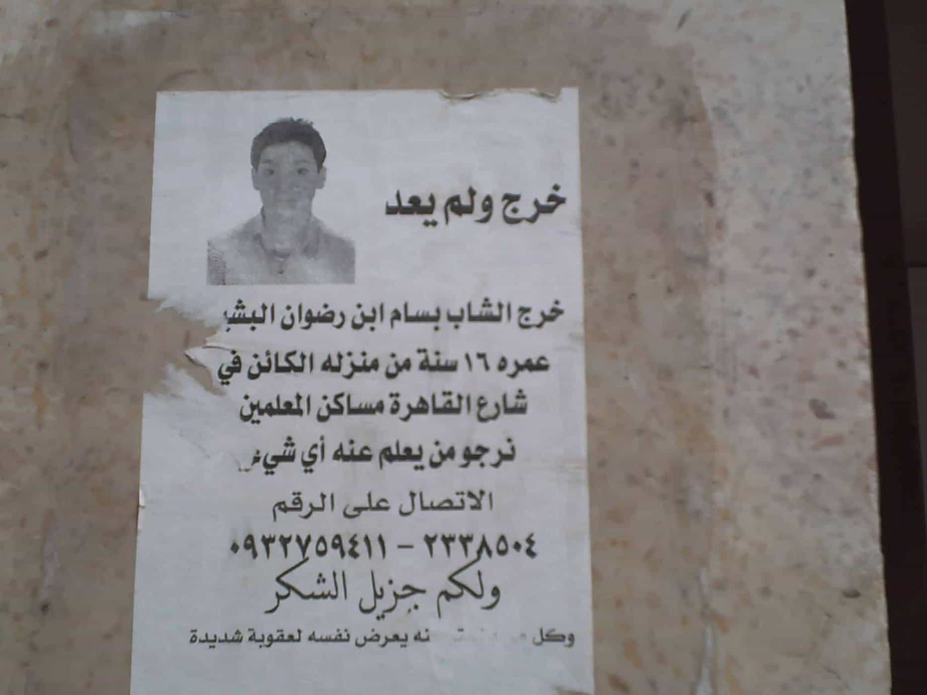ونعني بها مشكلة المفقودين الذين تنتشر ملصقات الإعلان عنهم في مختلف شوارع المدينة وأمام مراكز الانطلاق وأبواب المساجد والملاعب حيث يكثر تواجد الناس، وعلى صفحات الجرائد السورية على شكل إعلانات مأجورة.