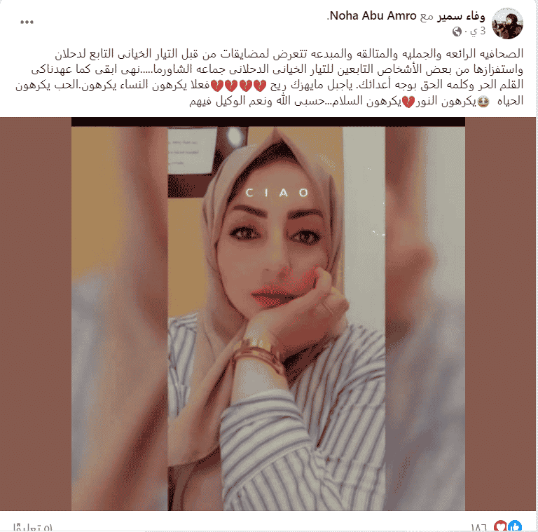 ناشطون فلسطينيون نشروا عبر مواقع التواصل مقاطع مصورة لناشطات فلسطينيات، يحكين فيها عن تعرضهن لمضايقات كبيرة من عناصر تيار محمد دحلان، في القاهرة ودبي بسبب رفضهم العمل ضمن التيار.