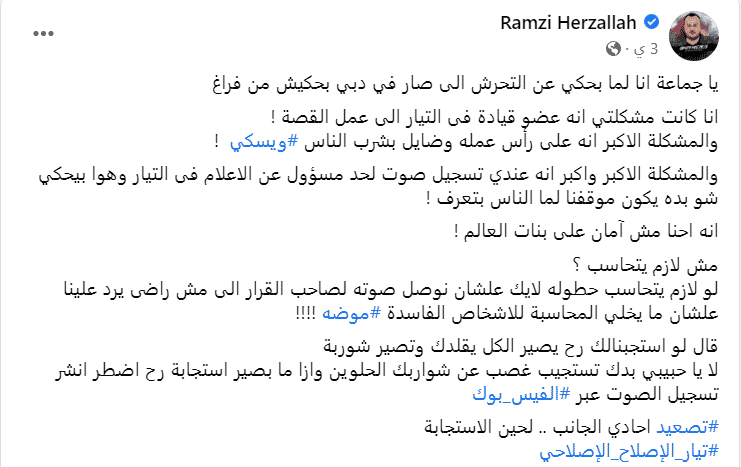وكتب في منشوره الذي رصدته (وطن) بفيسبوك ما نصه:“يا جماعة انا لما بحكي عن التحرش الى صار في دبي بحكيش من فراغ، انا كانت مشكلتي انه عضو قيادة فى التيار الى عمل القصة! والمشكلة الأكبر أنه على رأس عمله وضايل بشرب الناس #ويسكي ! “.