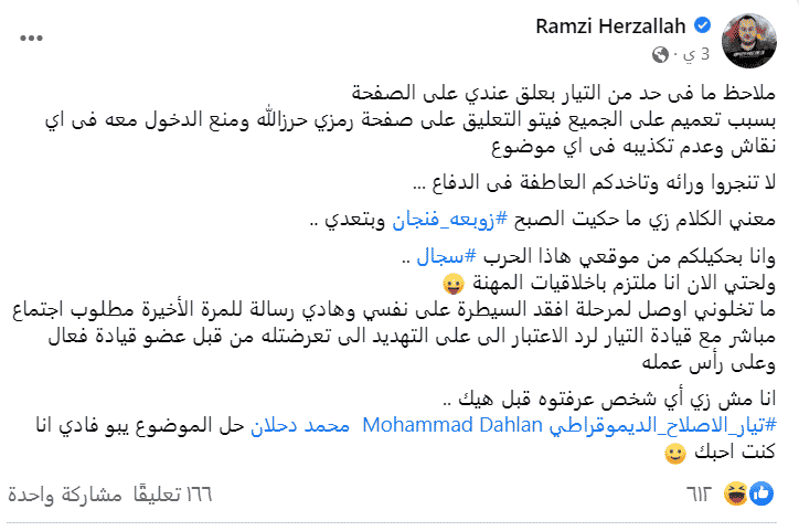 وأعلن رمزي في منشور له عبر صفحته الرسمية بفيسبوك، حصوله على شهادات ومستندات تثبت تورط التيار الإصلاحي التابع لدحلان في عمليات لا أخلاقية من التحرش والاعتداءات الجنسية والابتزاز في دبي.
