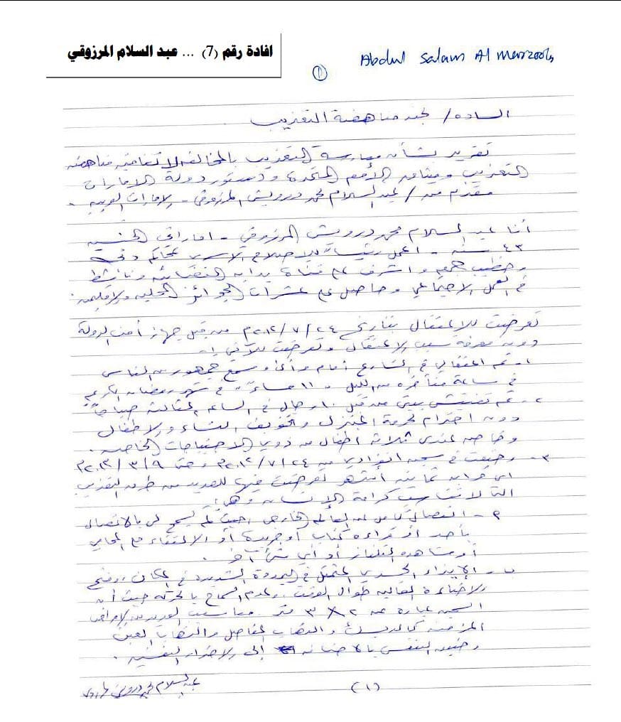 في #اليوم_الدولي_لمساندة_ضحايا_التعذيب، أرفق لكن تقرير كتبه والدي #عبدالسلام_درويش بخط يده في ٩/٥/٢٠١٣ بشأن التعذيب الذي تعرض له فترة اعتقاله!