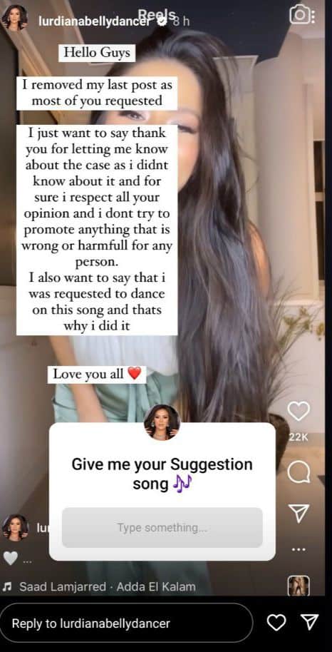 ولم تكتف الراقصة لورديانا بحذف الفيديو فقط عبر حسابها على “انستجرام”، والذي رقصت خلاله على أغنية “عدى الكلام”. بل قامت بالاعتذار أيضاً.