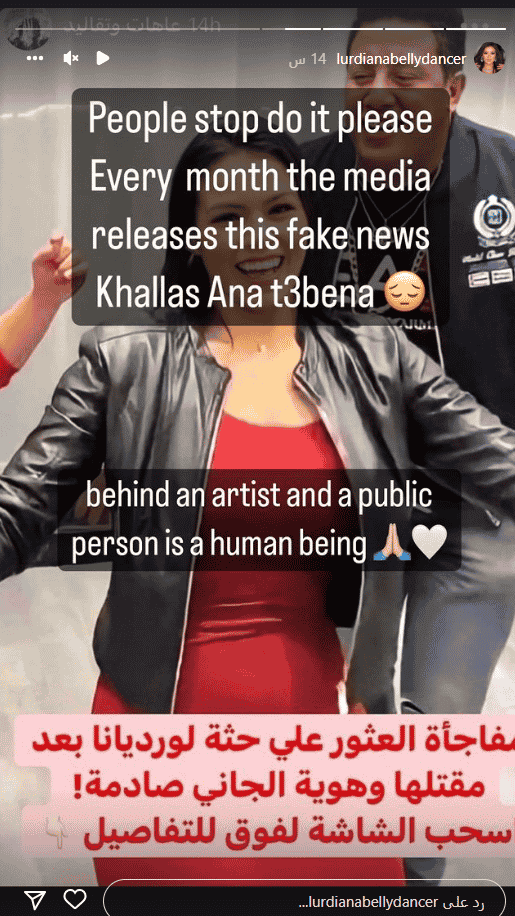 ونشرت لورديانا صورة لأنباء مقتلها المتداولة. وعلقت: “توقفوا يا ناس لو سمحتوا عن ذلك الأمر.. كل شهر بتنتشر الشائعات دي.. خلاص أنا تعبت”.