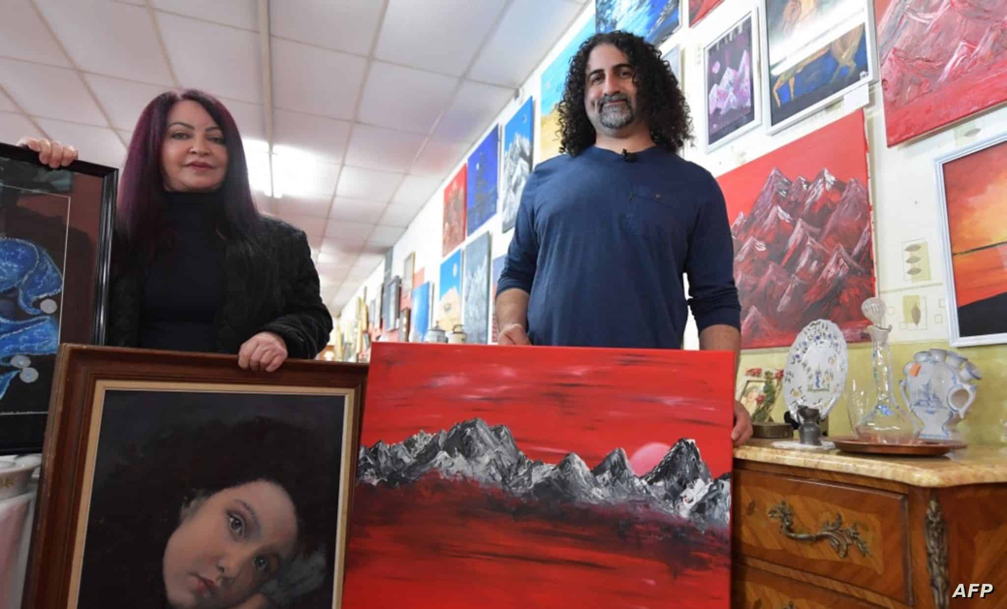 وظهر عمر بن لادن رفقة زوجته داخل معرض بجانب صورا من إنتاجهما معروضة للبيع.