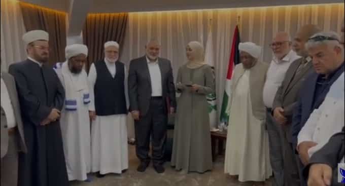 وتداول مستخدمو مواقع التواصل الاجتماعي مقطع فيديو، ظهر فيه الشيخ “الرفاعي” وعدد من رجال الدين، وإلى جانبهم رئيس المكتب السياسي لحركة حماس “إسماعيل هنية”، وحفيدته “سجى وسام هنية”، وهي تلقي كلمة لأهالي غزة، بمناسبة إكمالها حفظ القرآن الكريم كاملاً.