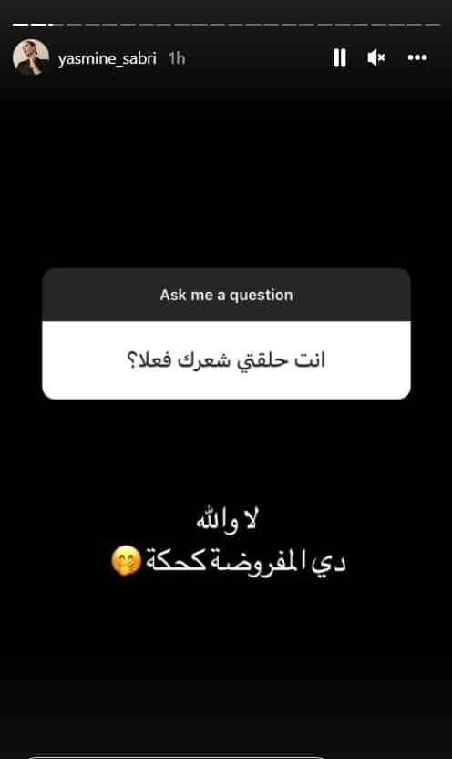 وتابعت “وطن” جانباً من الأسئلة التي وصلت إلى ياسمين صبري، وإجاباتها، حيث سألها أحد المتابعين: “انت حلقتي شعرك فعلاً؟”، لتردّ الفنانة بالقول: “لا والله دي المفروض كحكة”.