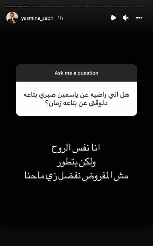 سؤال ثالث وصل الممثلة المصرية: “هل انتي راضية عن ياسمين دلوقتي عن بتاعة زمان؟”. حيث أجابت: “أنا نفس الروح ولكن بتطور ، مش المفروض نفضل زي ما حنا”.