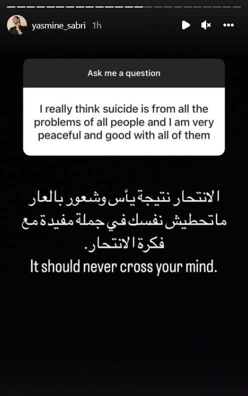 وورد إليها سؤال غريب عن الإنتحار، حيث قال مُرسله إنه يعتقد أن الانتحار ناتج عن مشاكل الناس. فأجابته ياسمين: “الانتحار نتيجة يأس وشعور بالعار ماتحطيش نفسك في جملة مفيدة مع فكرة الانتحار”.