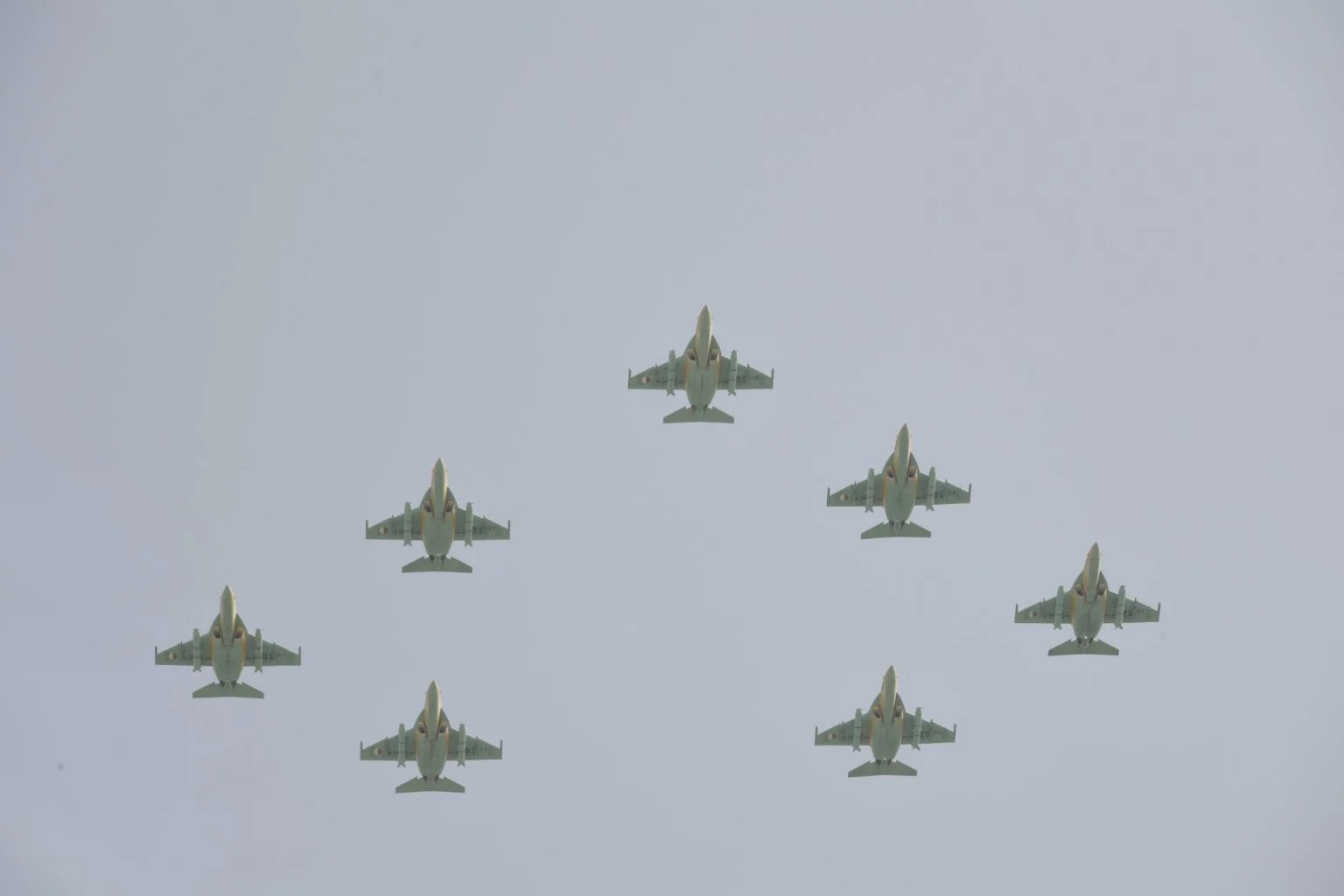 كما شمل العرض اقتحام طائرات من الجيل الرابع “سوخوي 30م ك أ” مكونة من ثماني طائرات للإسناد والتوغل، بالإضافة إلى تشكيلات مختلفة من المروحيات والحوامات وطائرات النقل التكتيكي والدعم الناري والمناورة والبحث والإنقاذ والمراقبة الجوية والحماية المدنية.