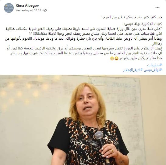 وكتبت نهلة الأستاذة في كلية الإعلام بجامعة دمشق عبر حسابها الشخصي في فيسبوك تدوينه قالت فيها بنبرة تهكم: “على ذمة مدري مين, قال وزارة حماية المدري شو اسمه.. ناوية تضيف على رغيف الخبز شوية مكملات غذائية, اشي فيتامينات على حديد, على لحسة زنك, مشان يصير رغيف الخبز وجبة كاملة متكاملة “.