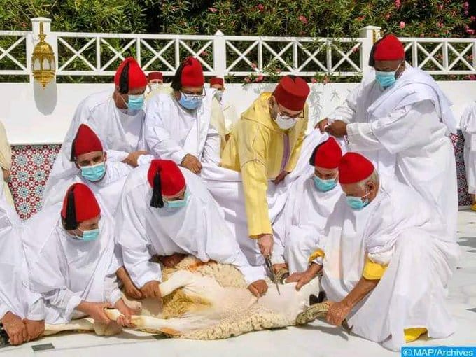 كما ظهر ملك المغرب أيضا وهو يشهد نحر الأضحية كعادته في كل عيد.